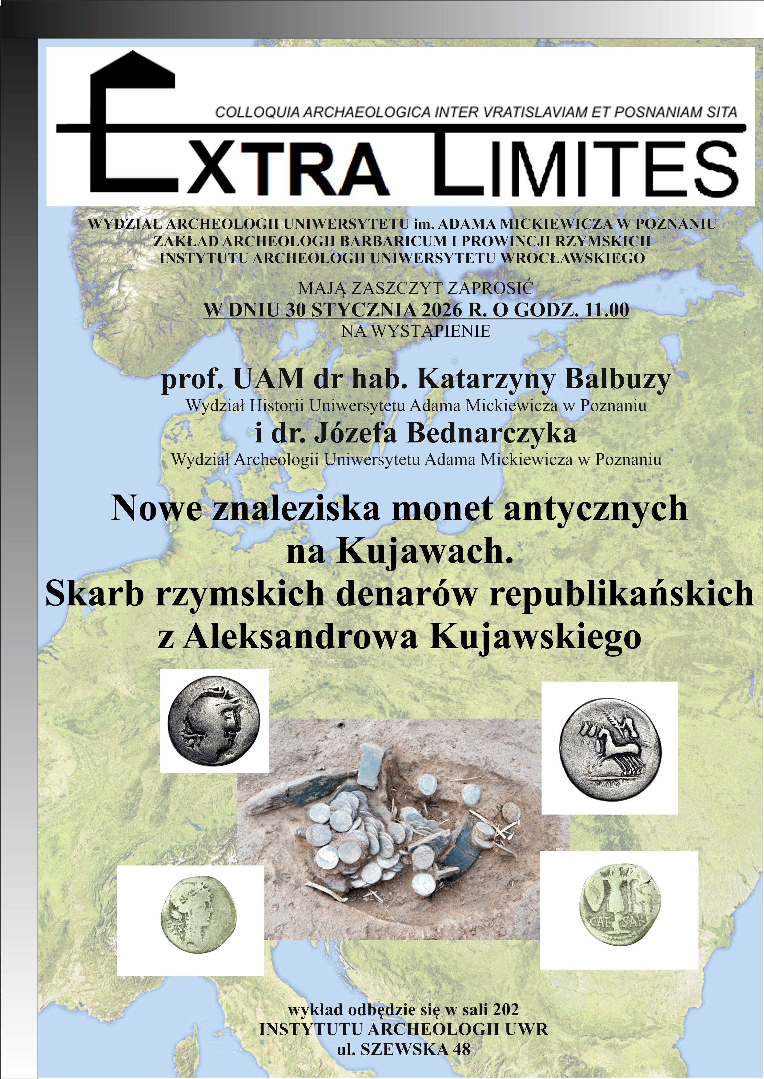 Szanowni Państwo, chcieliśmy serdecznie zaprosić na pierwsze w tym roku kalendarzowym seminarium w ramach projektu Extra limites, które odbędzie się tym razem we Wrocławiu. W piątek 30 stycznia tradycyjnie o 11.00 będziemy mieli okazję posłuchać wykładu prof. UAM dr. hab. Katarzyny Balbuzy z Wydziału Historii UAM oraz dr. Józefa Bednarczyka z Wydziału Archeologii UAM: „Nowe znaleziska monet antycznych na Kujawach. Skarb rzymskich denarów republikańskich z Aleksandrowa Kujawskiego”. Serdecznie zapraszamy!