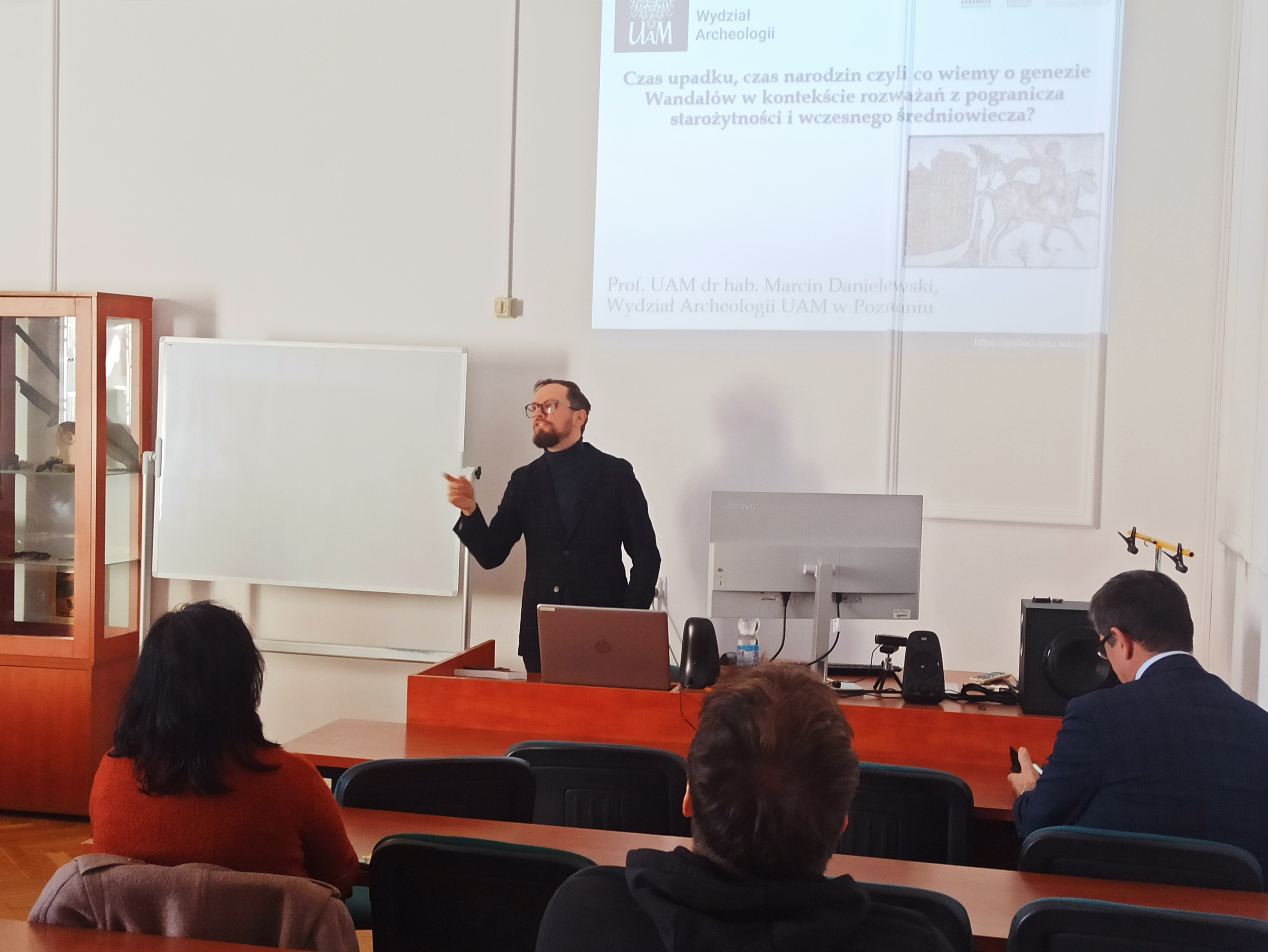 W piątek 28 listopada we Wrocławiu mieliśmy przyjemność gościć prof. UAM dr. hab. Marcina Danielewskiego z Wydziału Archeologii UAM w Poznaniu z wykładem: „Czas upadku, czas narodzin, czyli co wiemy o genezie Wandalów w kontekście rozważań z pogranicza starożytności i wczesnego średniowiecza”. Wykład bardzo starannie przygotowany, solidnie i rzetelnie bazujący na „czystych” źródłach, doskonały metodologicznie, a w swoich konkluzjach stanowiący rodzaj zimnego prysznica faktograficznego. No bo de facto co możemy powiedzieć o Wandalach i ich związkach z kulturą przeworską…? Naprawdę, bardzo niewiele, a pomimo tego nawet w naukowym dyskursie posługujemy się często kalkami, uproszczeniami, czy nawet nadinterpretacjami. Dyskusja po wykładzie była najdłużej trwającą w całej naszej jedenastoletniej karierze! Zaiste, warto z nami było być w ten listopadowy piątek!