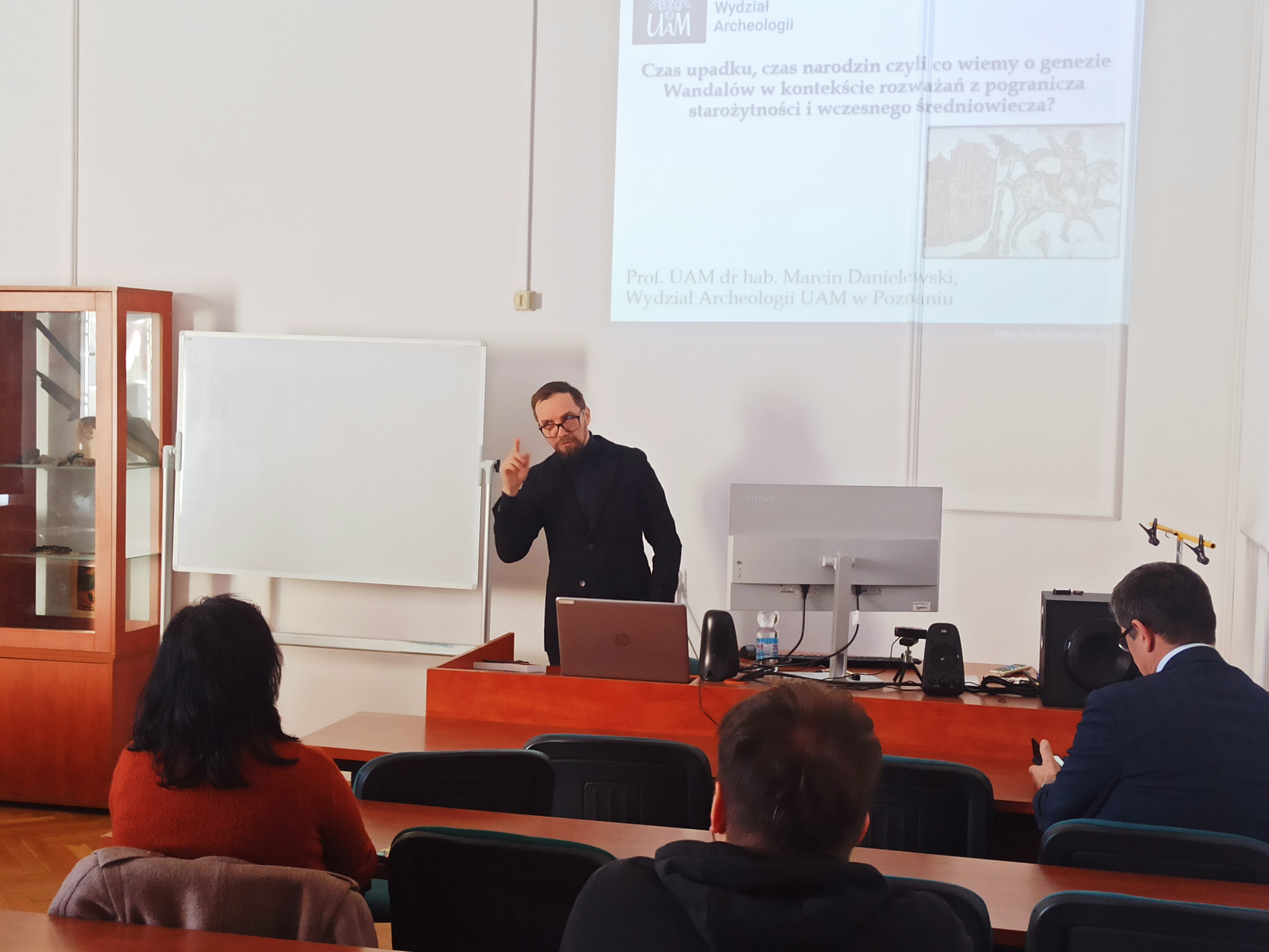 Wyjątkowo w czwartek 25 kwietnia na Wydziale Archeologii UAM referat pt. „Kobiety z długimi brodami” kontra „mężczyźni z kobiecymi włosami” czyli dlaczego wersja opowieści o pierwszym zwycięstwie Longobardów znana z Origo gentis Langobardorum jest bliższa oryginalnemu mitowi niż wersja przekazana przez Fredegara wygłosił prof. IH PAN dr hab. Robert Kasperski. Wystąpienie wprowadziło słuchaczy w skomplikowaną historię konfliktu Winnilów (Longobardów) z Wandalami i legendarne początki pierwszego z tych ludów. Nie zabrakło przy tym odniesień do mitologii skandynawskiej, koncepcji francuskiego filologa Georgesa Dumézila oraz licznych wątków związanych z wędrówką i losami obu wspomnianych wcześniej ludów. Prelegent dokonał szczegółowej analizy tekstu Origo gentis Langabardorum i pokazał jak fascynujące oraz wartościowe mogą być studia źródłoznawcze z zakresu historii, również dla archeologów. Warto podkreślić, że prof. Kasperski jest absolwentem dawnego Instytutu Historii UAM w Poznaniu i z pewnością wystąpienie na macierzystej uczelni było dla niego samego bardzo satysfakcjonujące. Tym bardziej, że w wykładzie udział wzięli bardzo liczni goście, a referat zamknęła interesująca dyskusja między historykiem a archeologami.