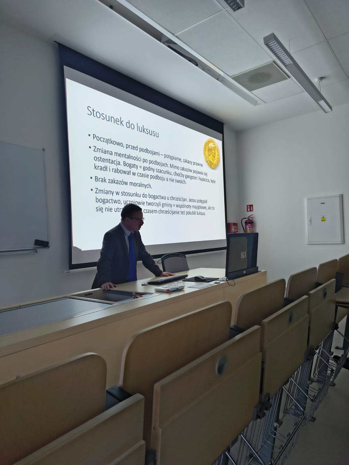 W piątek 12 grudnia 2025 r. w Poznaniu gościliśmy prof. UWr dr. hab. Mateusza Żmudzińskiego z Instytutu Archeologii Uniwersytetu Wrocławskiego z wykładem: „Kilka słów o zachciankach rzymskich bogaczy – luksusach bez umiaru”. Uczestniczyliśmy w spotkaniu z luksusem niebywałym, wprost niewyobrażalnym! Przejawiającym się w dziełach sztuki najwyższej klasy, wspaniałej architekturze, mozaikach, ale także z naszego, współczesnego punktu widzenia działaniach dziwacznych, czy wręcz niemoralnych… To, co docierało do Barbaricum, przynajmniej w zakresie zabytków ruchomych, jawi się nam w świetle zaprezentowanych faktów jedynie jako odpryski, resztki, cienie wielkiej, niesłychanie bogatej cywilizacji. Przepych ten i luksus jednocześnie budził krytykę współczesnych moralistów, którzy uważali go za oznakę zepsucia obyczajów, przeciwstawiając im proste, przaśne, ale „zdrowe” życie barbarzyńców.